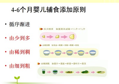 4-6個月(yue)的嬰兒(er)食(shi)物仍以母(mu)乳(或配(pei)方奶(nai))為主,輔(fu)食(shi)添加(jia)以嘗試吃為主要目(mu)的。添加(jia)的量從(cong)少量開始(shi)(shi),即從(cong)1- 2勺(shao)開始(shi)(shi),以后逐步增加(jia)。主要提(ti)供流質及泥(ni)糊狀(zhuang)食(shi)品(pin)。可依次提(ti)供鐵強化米(mi)粉(可用母(mu)乳、配(pei)方奶(nai)或蘋果汁調(diao)配(pei)),蔬(shu)菜泥(ni)(3-4種)后,水果汁或泥(ni)(果汁要從(cong)2:1,1:1兌水開始(shi)(shi),然(ran)后再(zai)喝原汁,接下來是果泥(ni)),雞蛋黃(5月(yue)齡(ling)),魚(yu)泥(ni)、雞肉、鴨肉、豬肉。