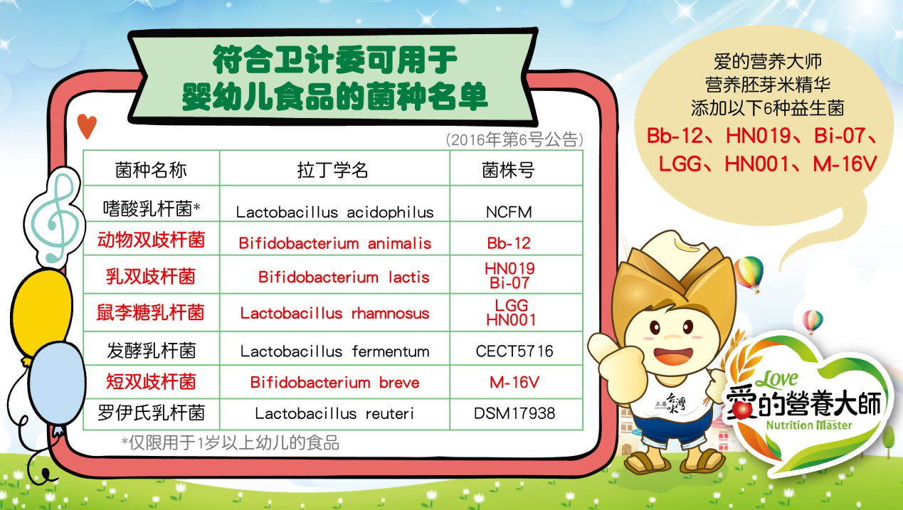 愛的(de)(de)營(ying)養大(da)(da)(da)師『6益(yi)菌(jun)(jun)(jun)』營(ying)養胚(pei)(pei)芽米(mi)精(jing)(jing)華、稻(dao)鴨米(mi)精(jing)(jing)華,原料來自(zi)『自(zi)有契約(yue)農田』優(you)質胚(pei)(pei)芽米(mi),胚(pei)(pei)芽米(mi)重量約(yue)占(zhan)大(da)(da)(da)米(mi)的(de)(de)2.5-3%,卻保有大(da)(da)(da)米(mi)營(ying)養的(de)(de)80%,能夠給(gei)寶(bao)寶(bao)更優(you)質的(de)(de)營(ying)養。此(ci)外,愛的(de)(de)營(ying)養大(da)(da)(da)師特(te)別從(cong)《可用于嬰幼兒食品的(de)(de)菌(jun)(jun)(jun)種名單》中,挑選6種益(yi)生菌(jun)(jun)(jun):乳(ru)雙歧(qi)(qi)桿(gan)菌(jun)(jun)(jun)(HN019)、乳(ru)雙歧(qi)(qi)桿(gan)菌(jun)(jun)(jun)(Bi-07)、 鼠李(li)(li)糖乳(ru)桿(gan)菌(jun)(jun)(jun)(LGG) 、短雙歧(qi)(qi)桿(gan)菌(jun)(jun)(jun)(M-16V)、 動物雙歧(qi)(qi)桿(gan)菌(jun)(jun)(jun)(Bb-12) 、鼠李(li)(li)糖乳(ru)桿(gan)菌(jun)(jun)(jun)(HN001),通(tong)過(guo)不(bu)同益(yi)生菌(jun)(jun)(jun)不(bu)同功效,互相搭配,給(gei)寶(bao)寶(bao)全方面的(de)(de)腸道(dao)呵護,搭建更完備的(de)(de)免疫(yi)防護網,從(cong)而提(ti)升寶(bao)寶(bao)免疫(yi)力(li)(li),提(ti)高身體(ti)抵抗(kang)力(li)(li)。